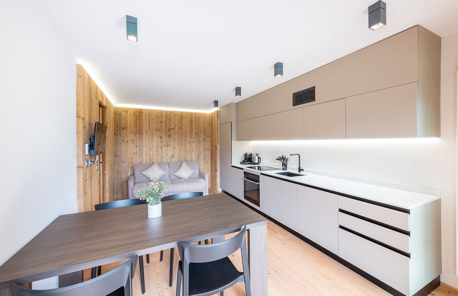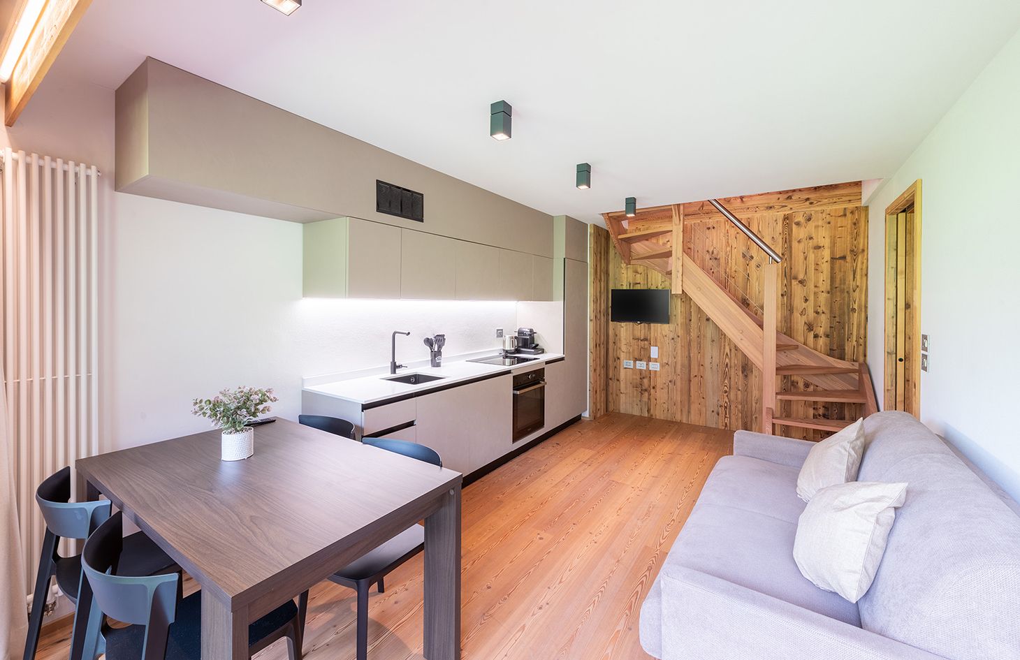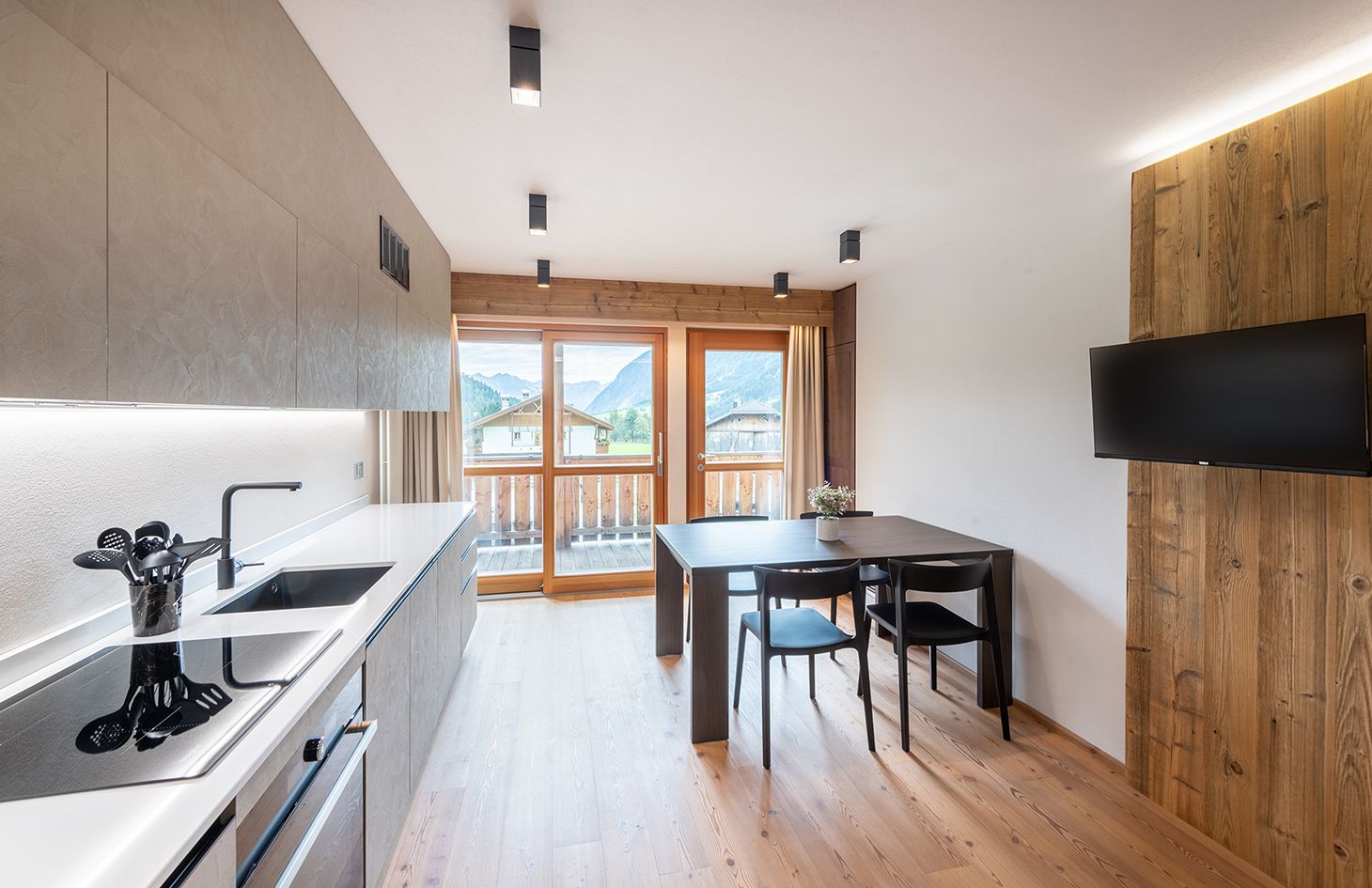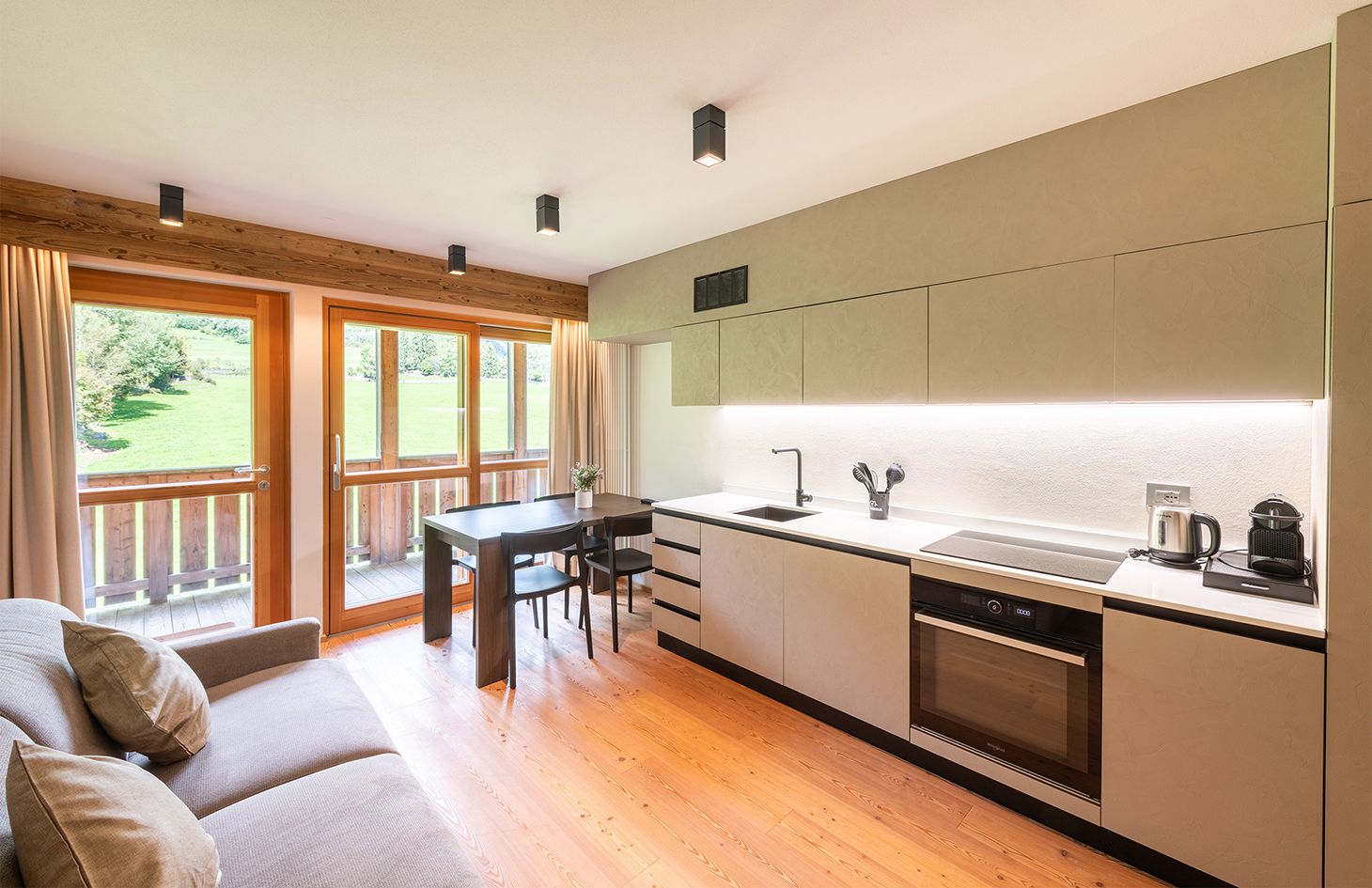 Perfetto per coppie o famiglie piccole, il nostro appartamento MOOS offre una camera da letto spaziosa, un comodo divano letto nel soggiorno, una cucina completamente attrezzata e un bagno moderno. Goditi il relax sul balcone con una vista mozzafiato sulle montagne circostanti. Ideale per un massimo di 4 ospiti.